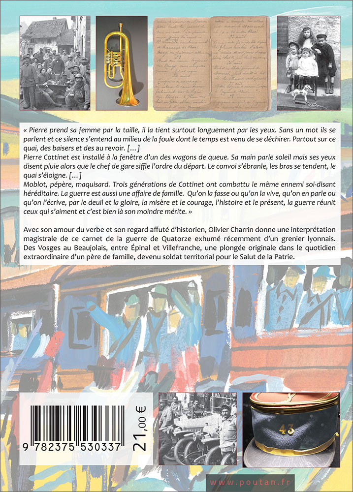 Avec son amour du verbe ciselé et son regard affuté d’historien, Olivier Charrin redonne vie à ce carnet de la Guerre de Quatorze exhumé récemment d’un grenier lyonnais. Des Vosges au Beaujolais, entre Épinal et Villefranche, une plongée originale dans le quotidien extraordinaire d’un père de famille, devenu soldat territorial pour la Salut de la Patrie.